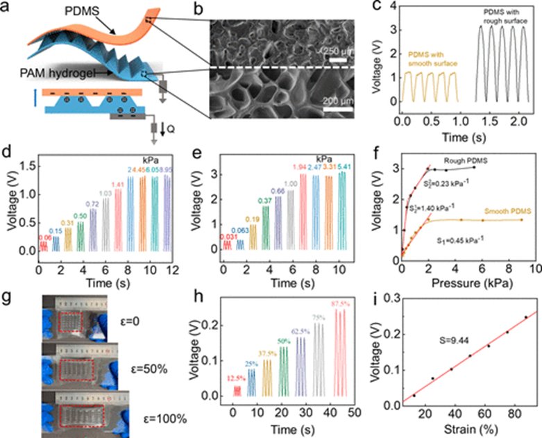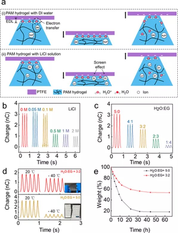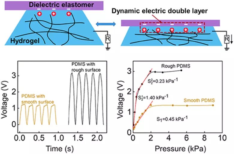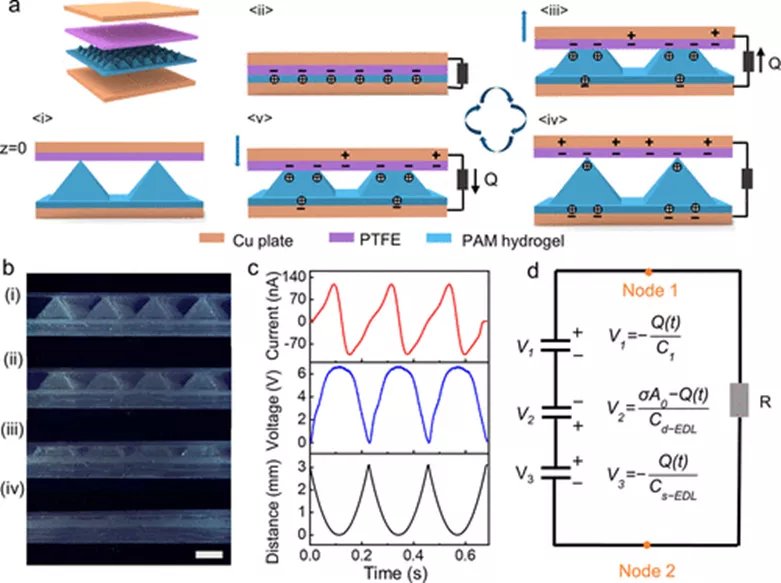 液固界面处的双电层 (EDL) 是许多研究领域的基础,从电化学和微流体到胶体化学。最近,科研人员通过机械调节水凝胶-电介质聚合物界面处的 EDL 来证明发电。发现水凝胶与介电聚合物之间的接触带电首先可以使介电聚合物表面带电;金字塔形水凝胶的机械变形导致 EDL 面积和电容的周期性变化,然后在外部电路中感应出交流电。