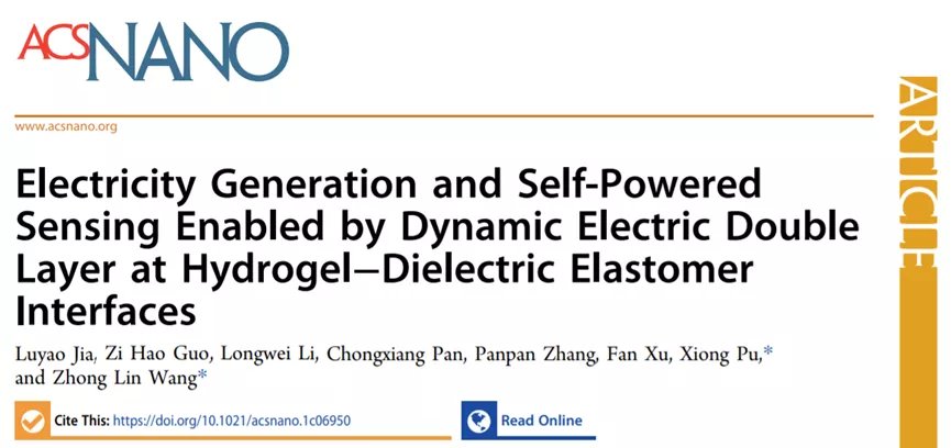 相关论文以题为Electricity Generation and Self-Powered Sensing Enabled by Dynamic Electric Double Layer at Hydrogel–Dielectric Elastomer Interfaces发表在《ACS Nano》上。通讯作者是中国科学院北京纳米能源与系统研究所蒲雄研究员和王中林院士。